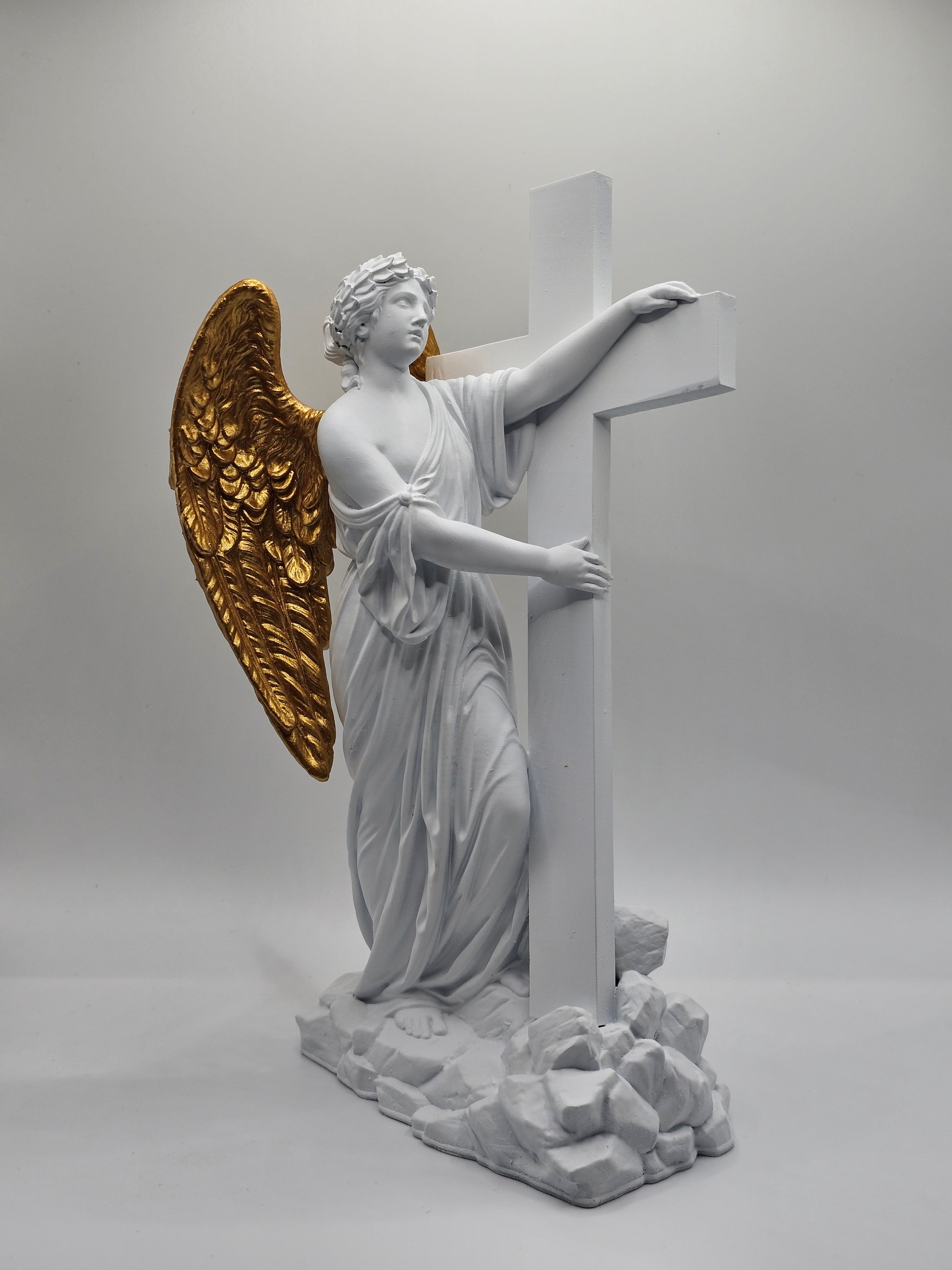 Resin statuette of an angel holding the Cross in his hands, with his golden wings.