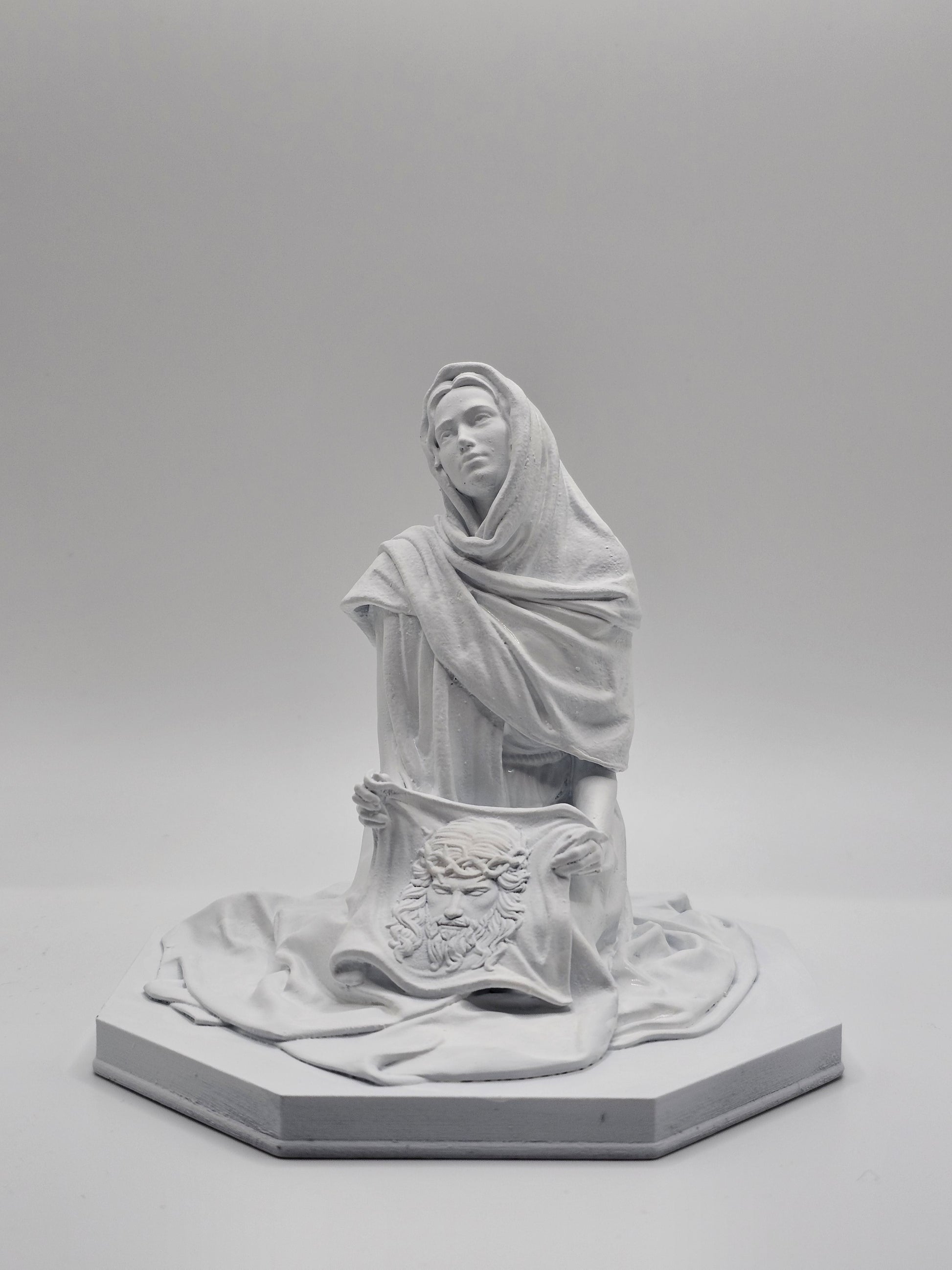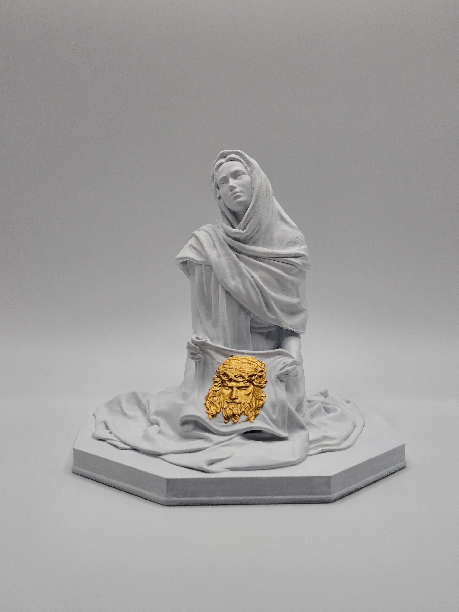 Saint Veronica was a pious woman who, during Jesus' Stations of the Cross, offered a veil to wipe Christ's bloody face. Her act of compassion resulted in a miracle, leaving the image of Jesus' face imprinted on the veil, which has since become a precious relic in the Catholic faith.